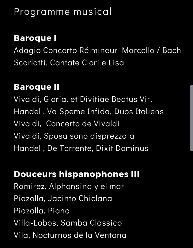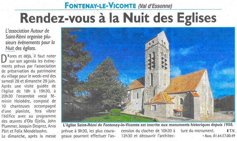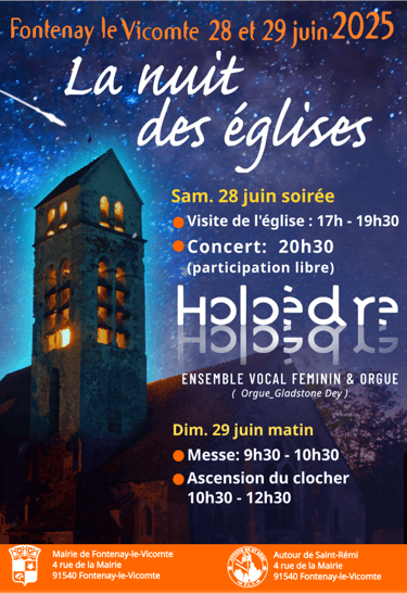 20 h 30, concert de l'ensemble vocal Holoèdre (bien connu à Fontenay) composé de 10 chanteuses et d'un organiste (Gladstone Dey)
